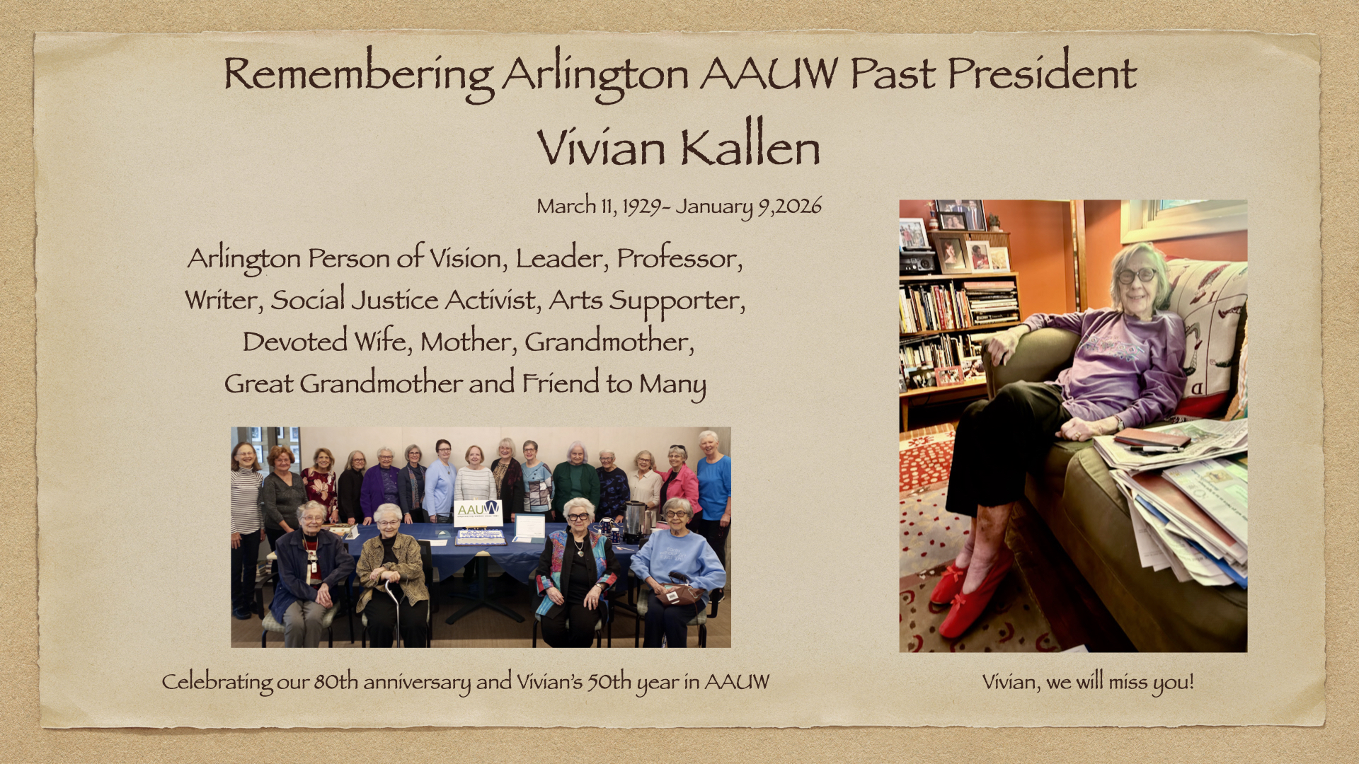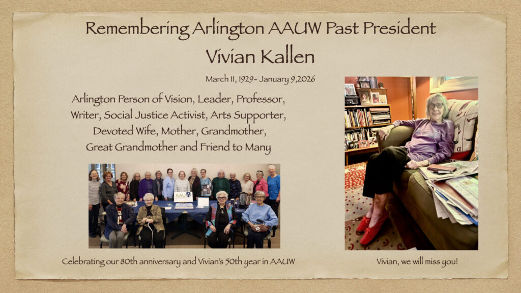 We are very sad to share that on January 9, our friend and past president Vivian Kallen passed away at age 96. Vivian was truly a force of nature who dedicated her life to making our society better for all. Vivian was very active in branch activities for more than 50 years. In fact, she was our speaker last year at a branch meeting co-sponsored with The Arlington-Alexandria League of Women Voters. She spoke about the ground breaking work of Delegate Katherine Stone. Arlington leaders including John Milliken were there to hear what Vivian recounted about how Delegate Stone was a voice for school integration.